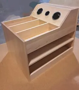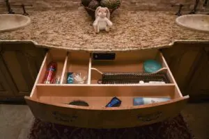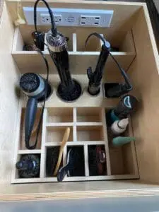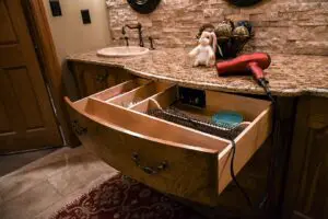 We manufacture vanity drawers from any materials to fit in isolated spaces and can build them with canisters to hold electrical units such as curling irons and hair dryers. What’s more, we can make spaces for outlets to be installed in the back of the drawer box for easy plug-in of electrical units.